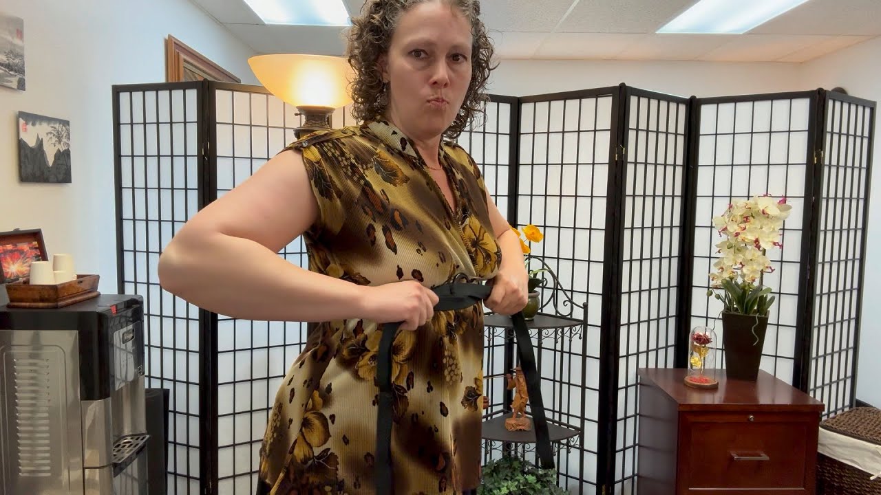 - A strap that will wrap around your waist comfortably (belt, yoga strap, or a long scarf will work).